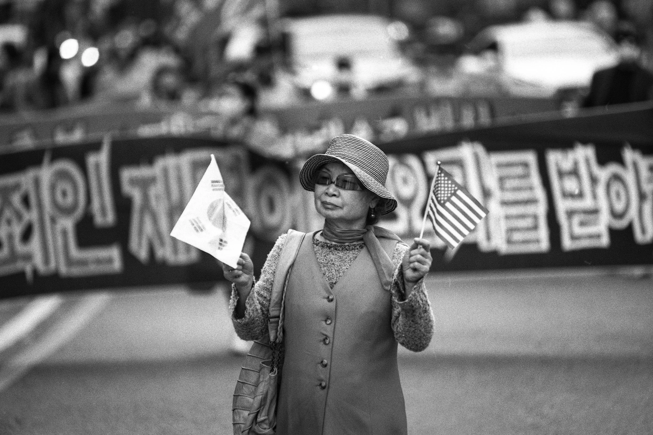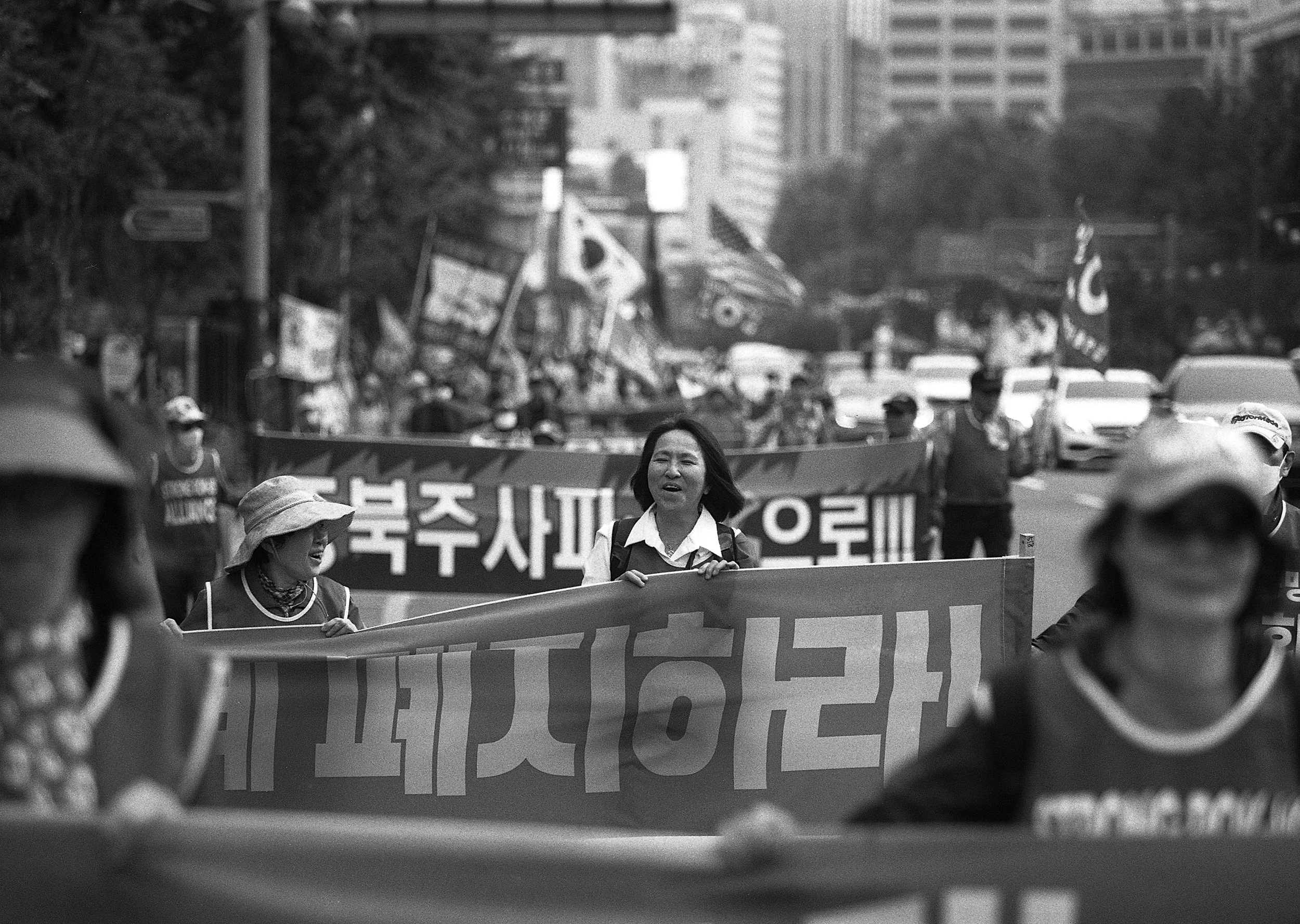 I was surprised that most demonstrators, who confidently marched while chanting for democracy, were elderly. I used black-and-white analog film to capture the proud demeanor, message, and atmosphere.